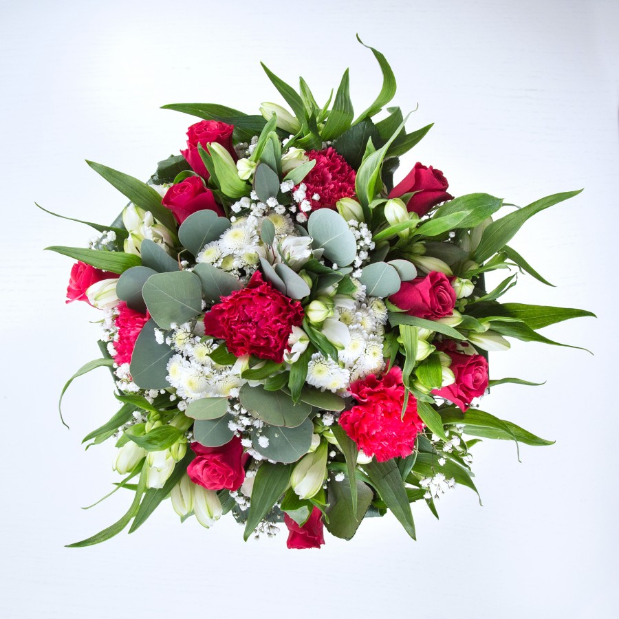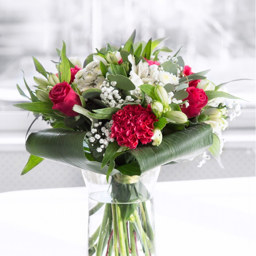 Our radiant bouquet is a celebration of nature’s beauty, combining the grace of white chrysanthemums and gypsophila with the passionate bloom of red roses and carnations. Enhanced by the subtle charm of white alstroemeria and aspidistra leaves, this arrangement is a true work of floral art. Each flower is meticulously hand-selected to ensure premium quality and the best display of colors.
