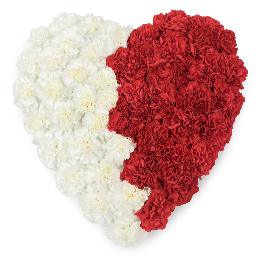 Our graceful heart-shaped bouquet blends exquisite white and red carnations, each hand-selected for their vibrant colors and supreme freshness. This elegant arrangement is perfect for expressing sympathy or deep affection, offering a luxurious and meaningful gift.